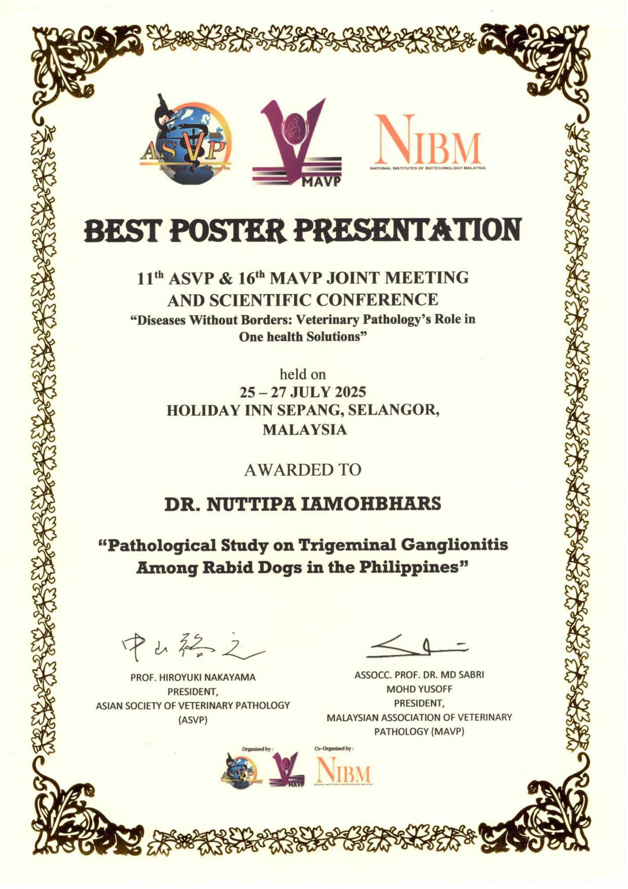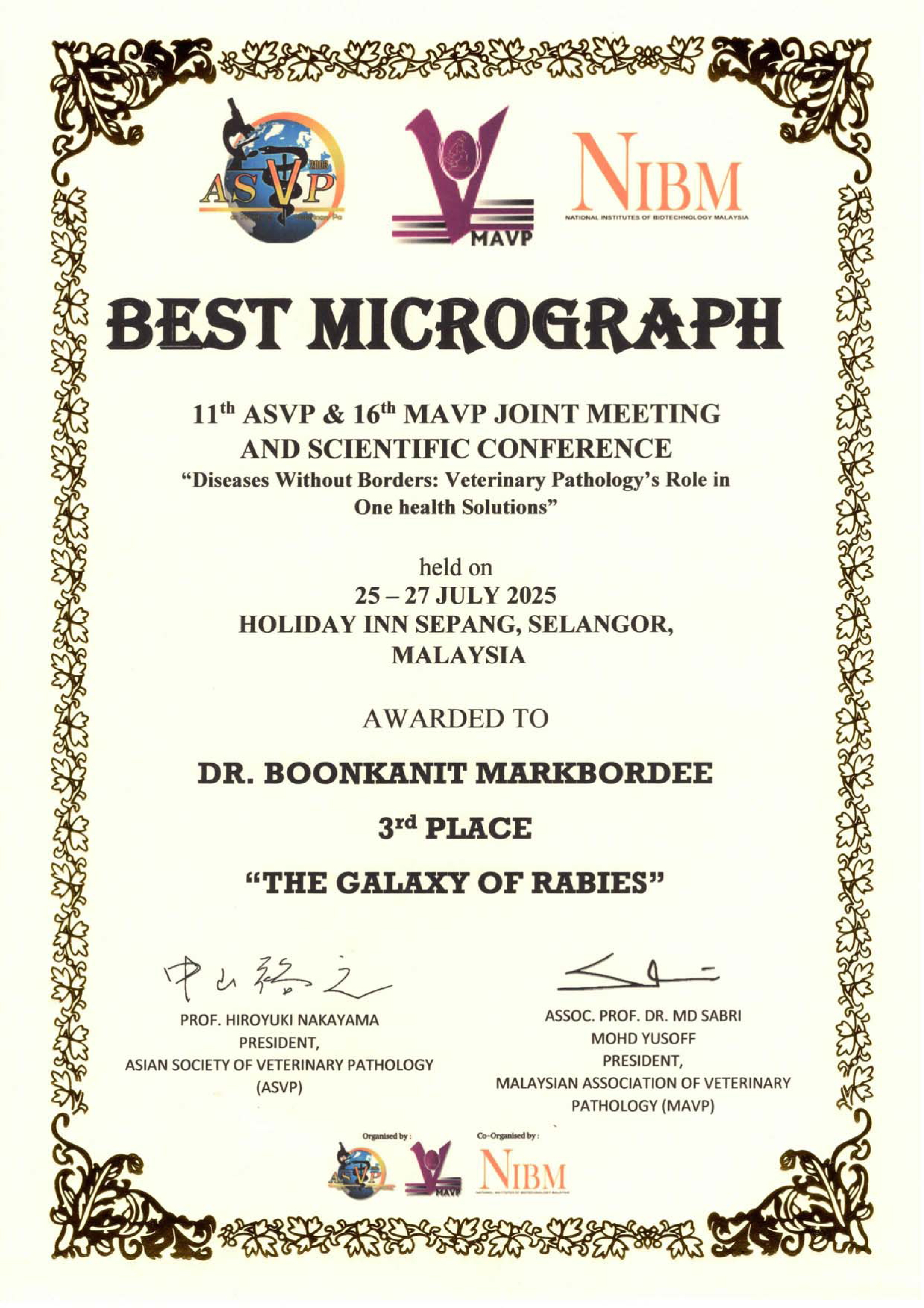 ASVPは, アジア地域における獣医病理学の発展および感染症をはじめとする重要課題に関する情報共有を目的として, 2003年に設立されました。現在, 日本, 韓国, 台湾, タイ, インドネシア, マレーシア, フィリピン, ベトナム, インド, パキスタンの10カ国が加盟しています。第11回大会は,マレーシアの首都クアラルンプールにて開催されました。ASVP学会は2年に一度開催されており, 加盟国間の学術的・専門的交流の促進に寄与しています。今回の受賞は, 狂犬病の病理発生機序および新規診断法の開発に関する長年の研究成果が高く評価されたものと考えています。狂犬病は, アジア地域における重要な人獣共通感染症の一つであり, 今後も本研究成果を基盤に新たな知見の発信を継続してまいります。本研究の遂行にあたり, 多大なるご支援・ご協力を賜りました関係各位に心より感謝申し上げます。