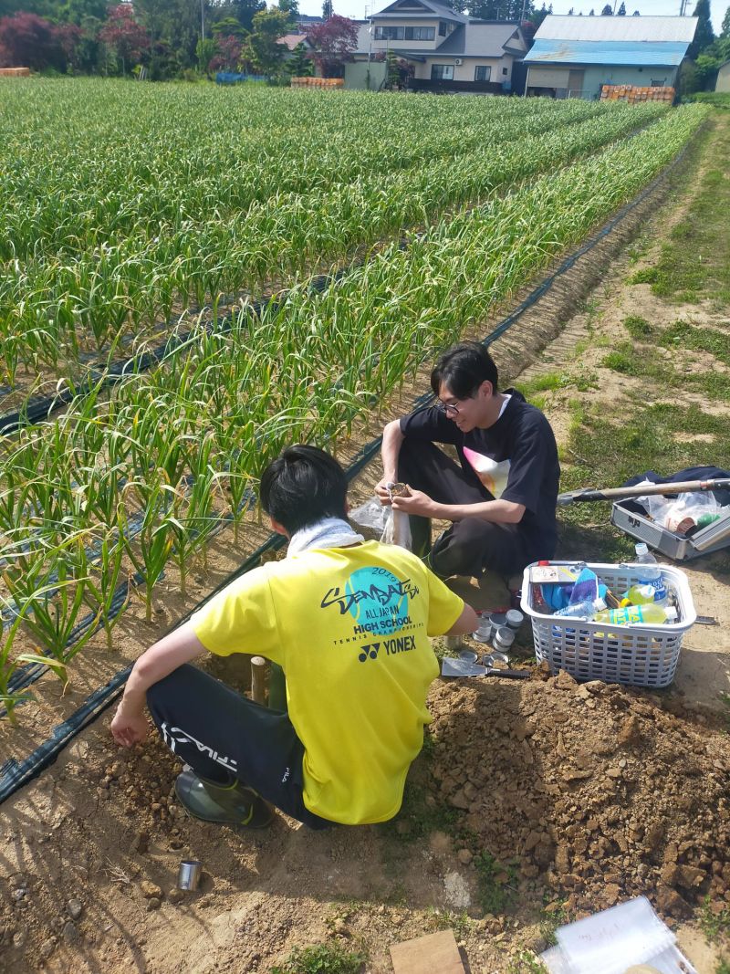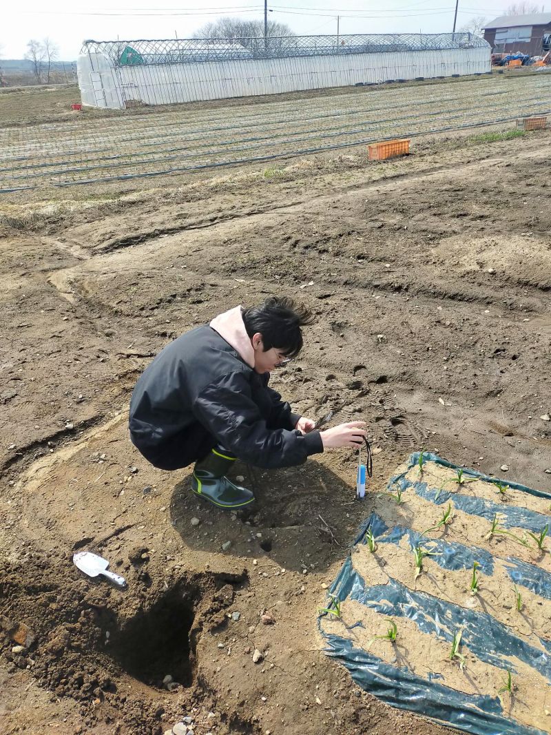 私たちの研究室では、ニンニク畑において,土壌中の水分と肥料成分の移動を経時的に測定することにより,養分状態の現状を把握することに取り組んでいます。最終的には、得られたデータをもとに、追肥の適切な量やタイミングについて農家の方々とともに検討していきたいと考えています。この研究は,他の作物にも応用可能であり,広く必要とされる研究になると考えています。