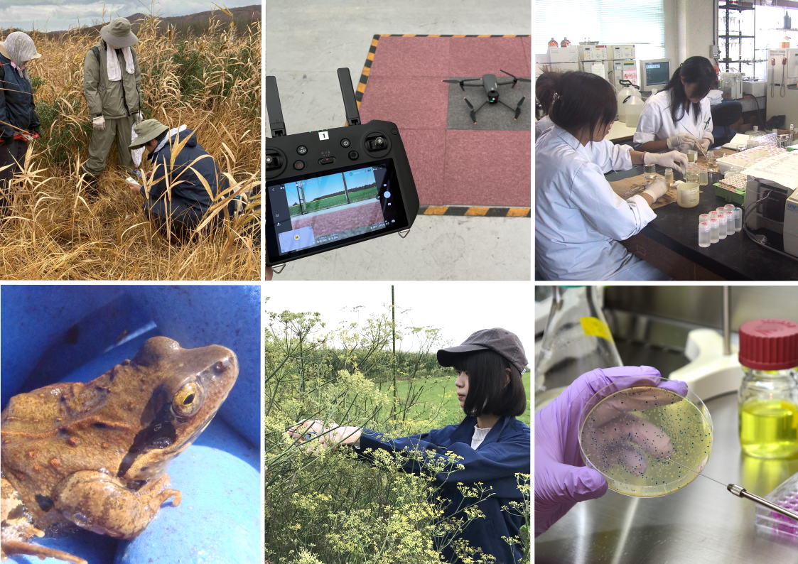 人工衛星、ドローン、各種センサーなどの最先端機器を使って、対象とするフィールド環境の状態や生態系の変化を遠隔から観測する方法を学びます。取得したデータは、データサイエンスの手法によって解析し、環境や生態系の変動を科学的に理解する力を養います。さらに、森林、海、湖沼、河川、ビオトープなど、多様な自然環境における動植物の生態保全や管理に貢献できる技術を身につけることができます。