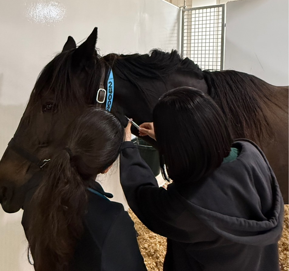 後半の臨床研修では、2人1組となり、整形外科、コミュニティプラクティス、皮膚科、馬科、救急科、腫瘍科をローテーションで回りました。診察・検査に加え、実際の手術の見学や、馬からの採血を体験するなど実践的な機会も得ました。さらに症例検討(ケーススタディ)に参加し、積極的に発言するアメリカの獣医学生の姿勢に刺激を受け、多くの学びを得ました。